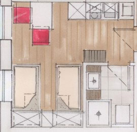 Küchenzeile und separate Sitzecke sind mit zeitgemäßem Komfort ausgestattet und bilden eine eigene Einheit im Raum. Mit abgetrenntem Bad-/Duschbereich. Die beiden getrennten Einzelbetten (90cm x 200cm) sind auch für gute Freunde und Freundinnen eine prima Wahl. Bei Nichtgebrauch können die Einzelbetten hochgeklappt werden, so dass die Fläche des Zimmers voll genutzt werden kann.
